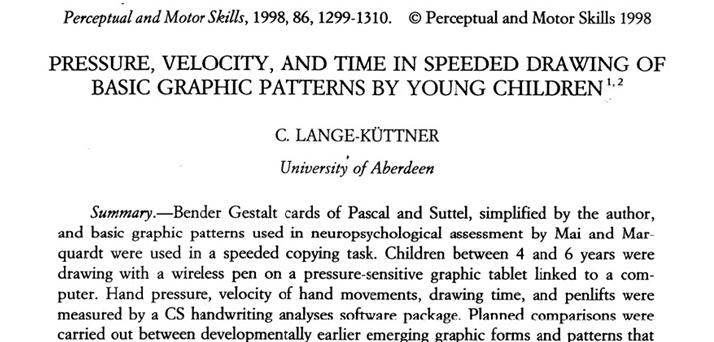 Lange-Küttner, C. (1998). Pressure, velocity and time in speeded drawing of basic graphic patterns in young children. Perceptual and Motor Skills, 86, 1299-1310. DOI: 10.2466/pms.1998.86.3c.1299
