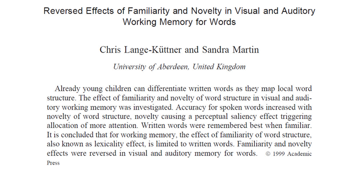 Lange-Küttner, C. & Martin, S. (1999). Reversed effects of familiarity and novelty in visual and auditory working memory for words. Brain and Cognition, 40, 159-162. DOI: 10.1006/brcg.1999.1066
