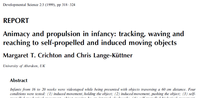 Crichton, M. T. & Lange-Küttner, C. (1999). Animacy and propulsion in infancy: Tracking, waving and reaching to self-propelled and induced moving objects. Developmental Science, 2, 318-324. DOI: 10.1111/1467-7687.00077