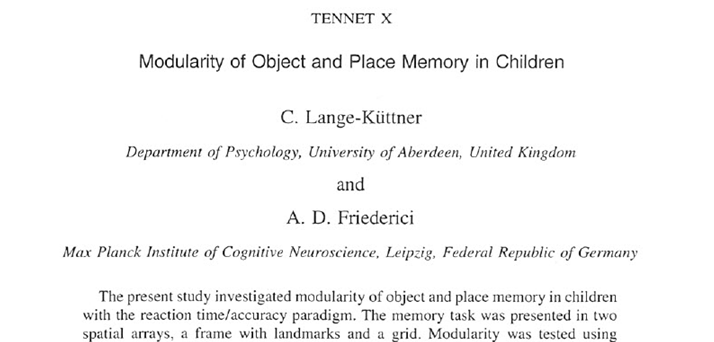 Lange-Küttner, C., & Friederici, A.D. (2000). Modularity of object and place memory in children. Brain and Cognition, 43, 302-305. DOI: 10.1006/brcg.1999.1135