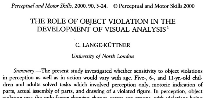 Lange-Küttner, C. (2000). The role of object violation in the development of visual analysis. Perceptual and Motor Skills, 90, 3-24. DOI: 10.2466/PMS.90.1.3-24