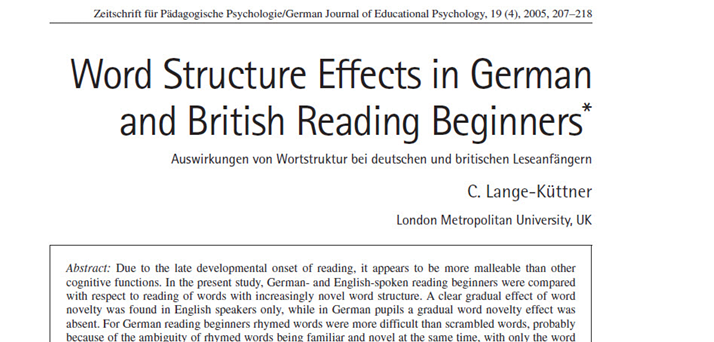 Lange-Küttner, C. (2005). Word structure effects in German and British reading beginners. Zeitschrift für Pädagogische Psychologie/German Journal of Educational Psychology, 19, 207-218. DOI: 10.1024/1010-0652.19.4.207