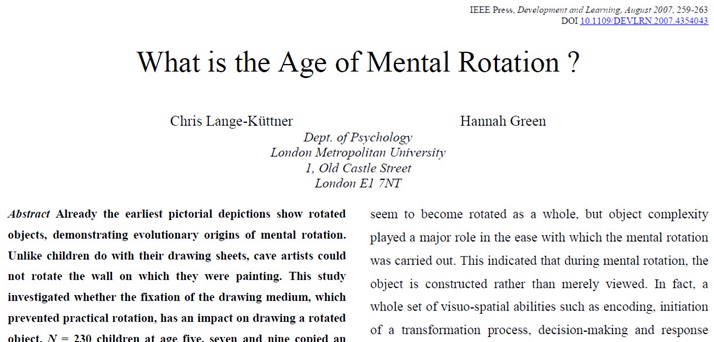 Lange-Küttner, C. & Green, H. (2007). What is the age of mental rotation ? Proceedings of the 6th International Conference on Development and Learning, IEEE Press, 259-263. DOI: 10.1109/DEVLRN.2007.4354043