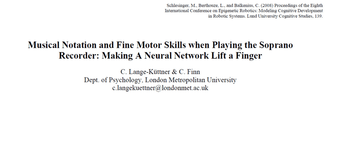 Lange-Küttner, C., & Finn, C. (2008). Musical notation and fine motor skills when playing the soprano recorder: Making a neural network lift a finger (pp. 69-76). In Schlesinger, M., Berthouze, L., & Balkenius, C. (Eds.). Proceedings of the 8th International Conference on Epigenetic Robotics: Modeling cognitive development in robotic systems. Lund University Cognitive Studies, Volume 139. http://www.informatics.sussex.ac.uk/events/epirob/Papers/Lange-Kuettner%20Paper%20Epirob08.pdf