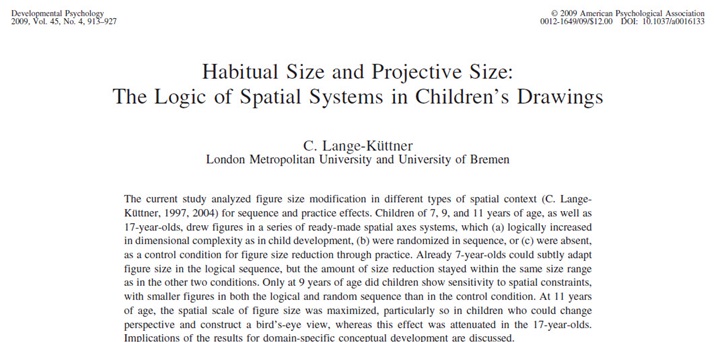 Lange-Küttner, C. (2009). Habitual size and projective size: The logic of spatial systems in children’s drawings. Developmental Psychology, 4, 913-927. DOI:10.137/a0016133