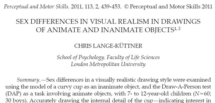 Lange-Küttner, C. (2011). Sex differences in visual realism in drawings of animate and inanimate objects. Perceptual and Motor Skills, 113, 439-453. DOI:10.2466/04.10.24.PMS.113.5.439-453