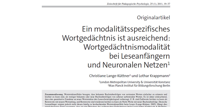 Lange-Küttner, C. & Krappmann, L. (2011). Ein modalitätsspezifisches Wortgedächtnis ist ausreichend: Wortgedächtnismodalität bei Leseanfängern und neuronalen Netzen (One modality-specific word memory is sufficient. Word memory modality in reading beginners and neural networks, engl. abstract). Zeitschrift für Pädagogische Psychologie/German Journal of Educational Psychology, 25, 19-37. DOI:10.1024/1010-0652/a000027