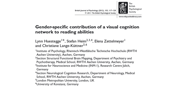 Hystegge, L., Heim, S., Zettelmeyer, E., & Lange-Küttner, C. (2012). Gender-specific contribution of a visual cognition network to reading abilities. British Journal of Psychology, 103, 117-128. DOI:10.1111/j.-2044-8295.2011.02050.x