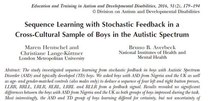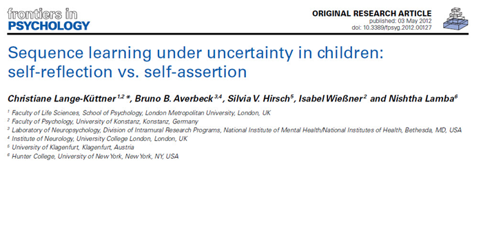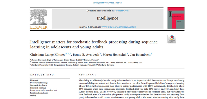 Lange-Küttner, C., Averbeck, B. B., Hentschel, M., & Baumbach, J. (2021). Intelligence matters for stochastic feedback processing during sequence learning in adolescents and young adults. Intelligence. https://doi.org/10.1016/j.intell.2021.101542