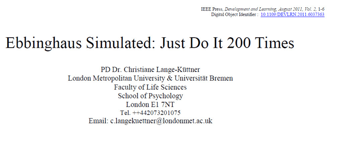 Lange-Küttner, C. (2011). Ebbinghaus simulated: Just do it 200 times. Development and Learning, 2, 1-6. DOI: 10.1109/DEVLRN.2011.6037363