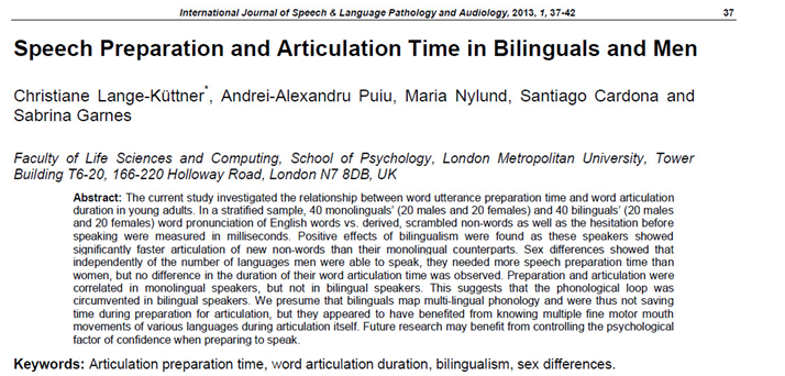 Lange-Küttner, C., Puiu, A.-A., Nylund, M., Cardona, S., & Garnes, S. (2013). Speech preparation and articulation time in bilinguals and men. International Journal of Speech and Language Pathology and Audiology, 1, 37-42. DOI:10.12970/2311-1917.2013.01.01.5