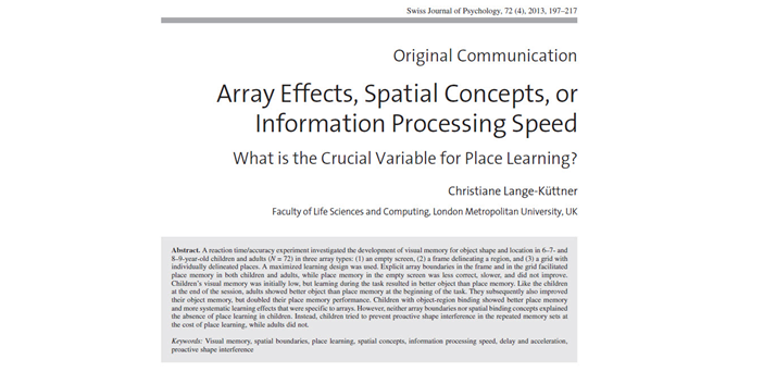 Lange-Küttner, C. (2013). Array effects, spatial concepts, or information processing speed: Which is the crucial variable for place learning ? Swiss Journal of Psychology, 72, 197-217. DOI:10.1024/1421-0185/a000113