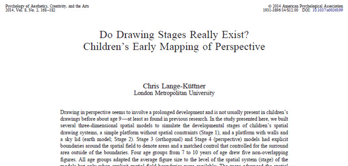Lange-Küttner, C. (2014). Do drawing stages really exist? Children’s early mapping of perspective. Psychology of Aesthetics, Creativity, and the Arts, 8, 168-182. DOI: 10.1037/a0036199