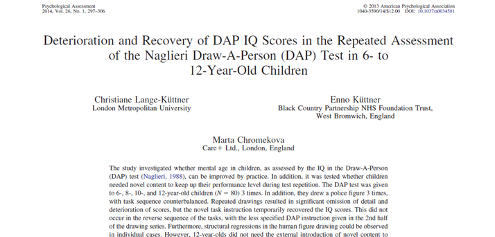 Lange-Küttner, C., Küttner, E., & Chromekova, M. (2014). Deterioration and recovery of DAP IQ scores in the repeated assessment of the Naglieri Draw-A-Person Test in 6- to 12-year-old children. Psychological Assessment, 26, 297-306. DOI: 10.1037/a0034581