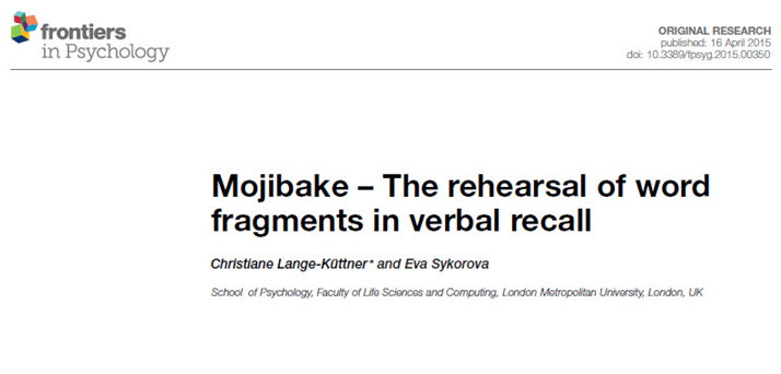 Lange-Küttner, C. & Sykorova, E. (2015). Mojibake: The rehearsal of word fragments in verbal recall. In Lehmann, M., Hasselhorn, M. & Jarrold, C. (Eds.) Research Topic: What is developed in the development of rehearsal? Frontiers in Psychology, 6, Article 350, DOI: 10.3389/fpsyg.2015.00350