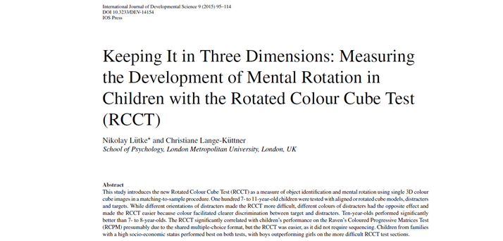 Lütke, N., & Lange-Küttner, C. (2015). Keeping it in three dimensions: Measuring the development of mental rotation in children with the Rotated Colour Cube Test (RCCT). International Journal of Developmental Science, 9, 95-114. DOI 10.3233/DEV-14154