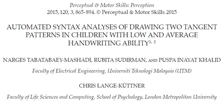 Tabatabaey-Mashadi, N., Sudirman, R., Inayat Khalid, P., & Lange-Küttner, C. (2015). Automated syntax analysis of drawing two tangent patterns in children with low and average handwriting ability. Perceptual and Motor Skills, 120, 1-30. DOI: 10.2466/24.10.PMS.120v15x1