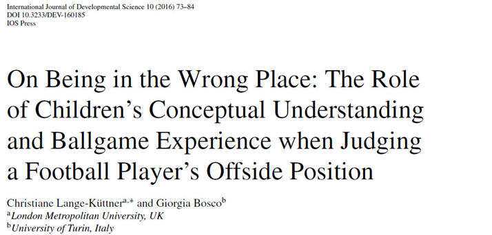 Lange-Küttner, C. & Bosco, G. (2016). On being in the wrong place: The role of children’s conceptual understanding and ballgame experience when judging a football player’s offside position. International Journal of Developmental Science, 10, 73-84. DOI 10.3233/DEV-160185