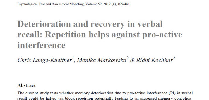 Lange-Küttner, C., Markowska, M. & Kochhar, R. (2017). Deterioration and recovery in verbal recall: Repetition helps against pro-active interference. Psychological Test and Assessment Modeling, 59 (4), 405-441. http://www.psychologie-aktuell.com/fileadmin/download/ptam/4-2017_20171218/02_Lange.pdf