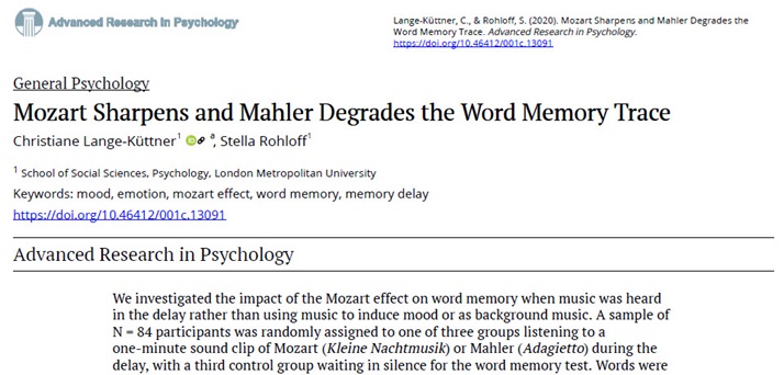 Lange-Küttner, C. & Rohloff, S. (2020). Mozart sharpens and Mahler degrades the word memory trace. Advanced Research in Psychology, 1 DOI:10.46412/001c.13091