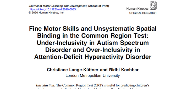 Lange-Küttner, C. & Kochhar, R. (2020). Unsystematic spatial coding in the Common Region Test (CRT): Under-inclusivity in ASD and over-inclusivity ADHD. Motor Development and Learning, 8(3), 544-568. DOI: 10.1123/jmld.2019-0033.