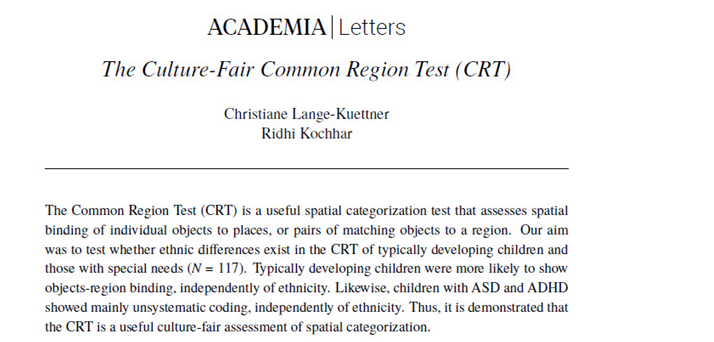 Lange-Küttner, C. & Kochhar, R. (2021). The culture-fair Common Region Test (CRT). Academia Letters, Article 103, 1-7, DOI 10.20935/AL103