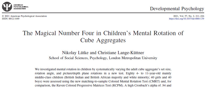 https://www.apa.org/pubs/databases/psyctestsLütke, N. & Lange-Küttner, C. (2021). The magical number four in children’s mental rotation of cube aggregates. Developmental Psychology, 57(2), 211-226. DOI 10.1037/dev0001139