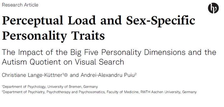 Lange-Küttner, C., & Puiu, A.A. (2021). Perceptual load and sex-specific personality traits: The impact of the Big Five personality dimensions and the autism quotient on visual search. Experimental Psychology, 68(3). https://doi.org/10.1027/1618-3169/a000520